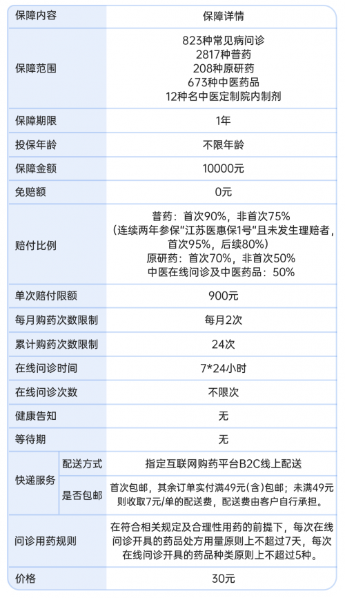 针对这一现状,2026年度江苏医惠保1号创新推出互联网门诊险,每年仅需30元即可享受全年不间断的在线医疗服务。该产品突破传统保险只保大病的局限,提供包括24小时在线问诊、超3000种药品直赔配送、0免赔额即时报销等核心服务,将健康保障延伸至日常高频医疗场景。